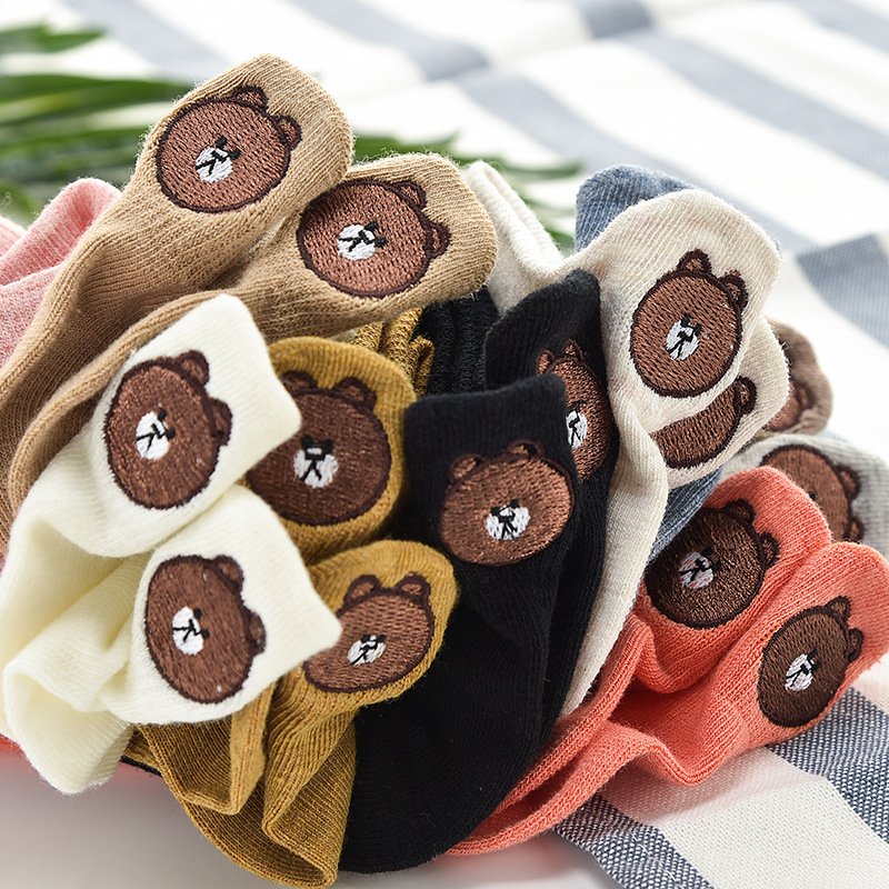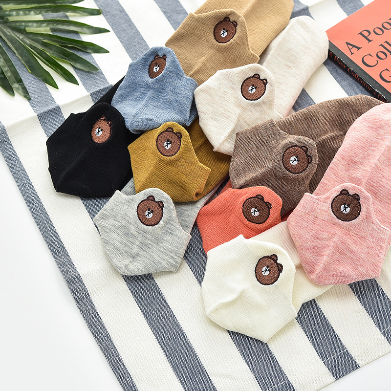 (10 pairs)Woman Cute Embroidered Cartoon Bear Cotton Socks Kawaii Candy Color Breathable Comfortable Boat Socks Female Casual Sock Ladies Ankle Socks