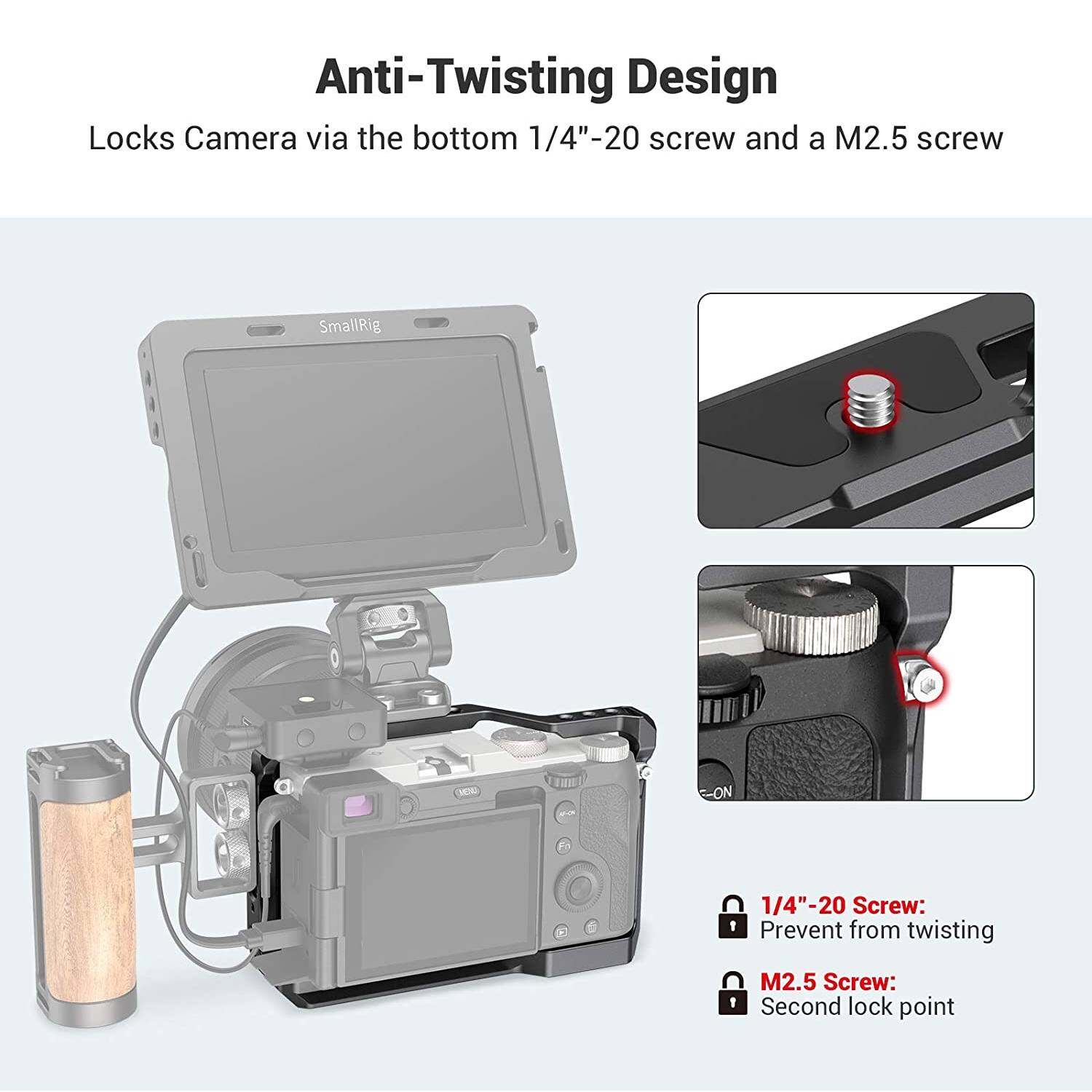 2. Firmly Fixed to Camera by a 1/4"-20 Screw and Anti-twist Pins.