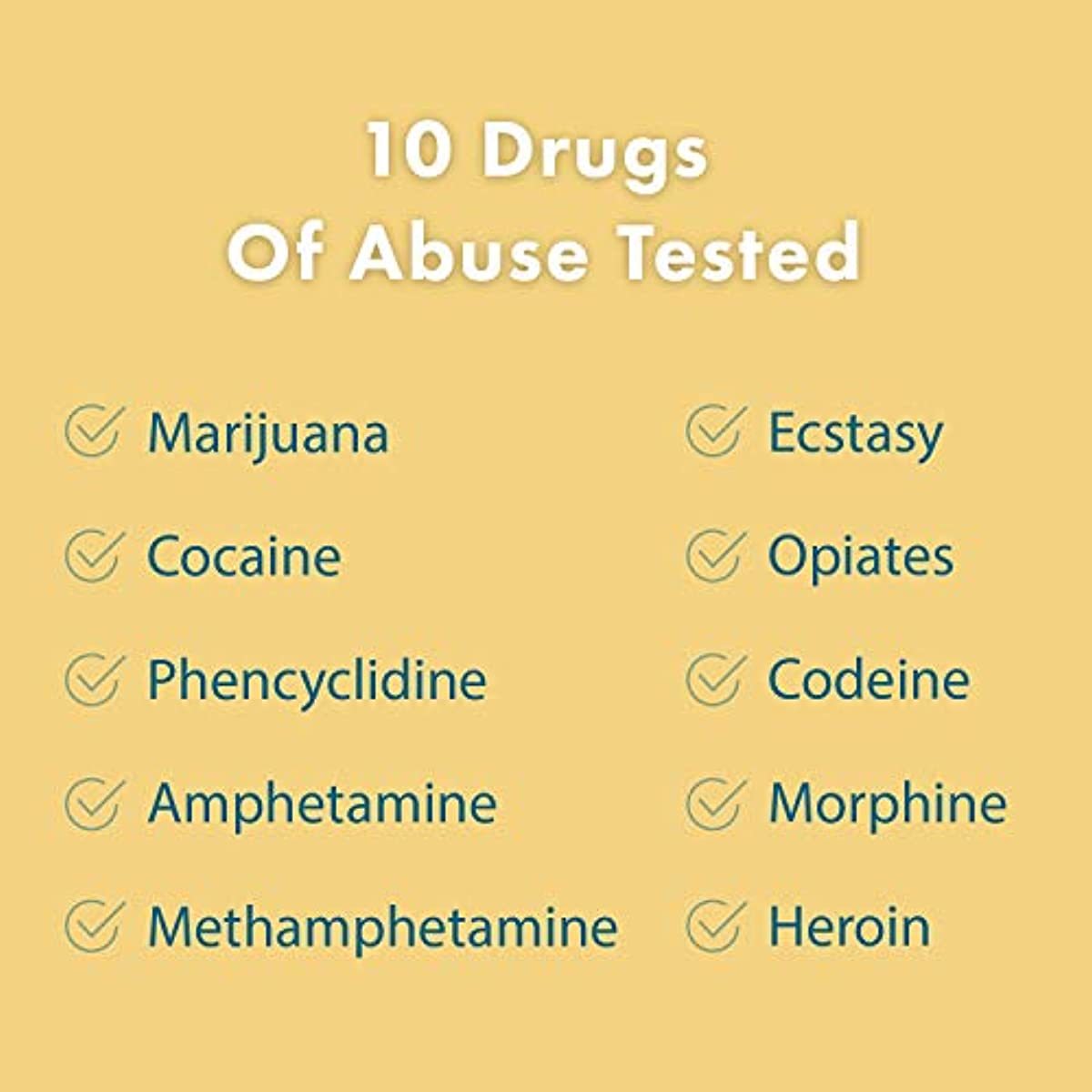 • Tests for ten (10) drugs of abuse: Marijuana, Cocaine, Opiates, Amphetamine, Methamphetamine, Ecstasy, PCP, Heroin, Codeine, and Morphine