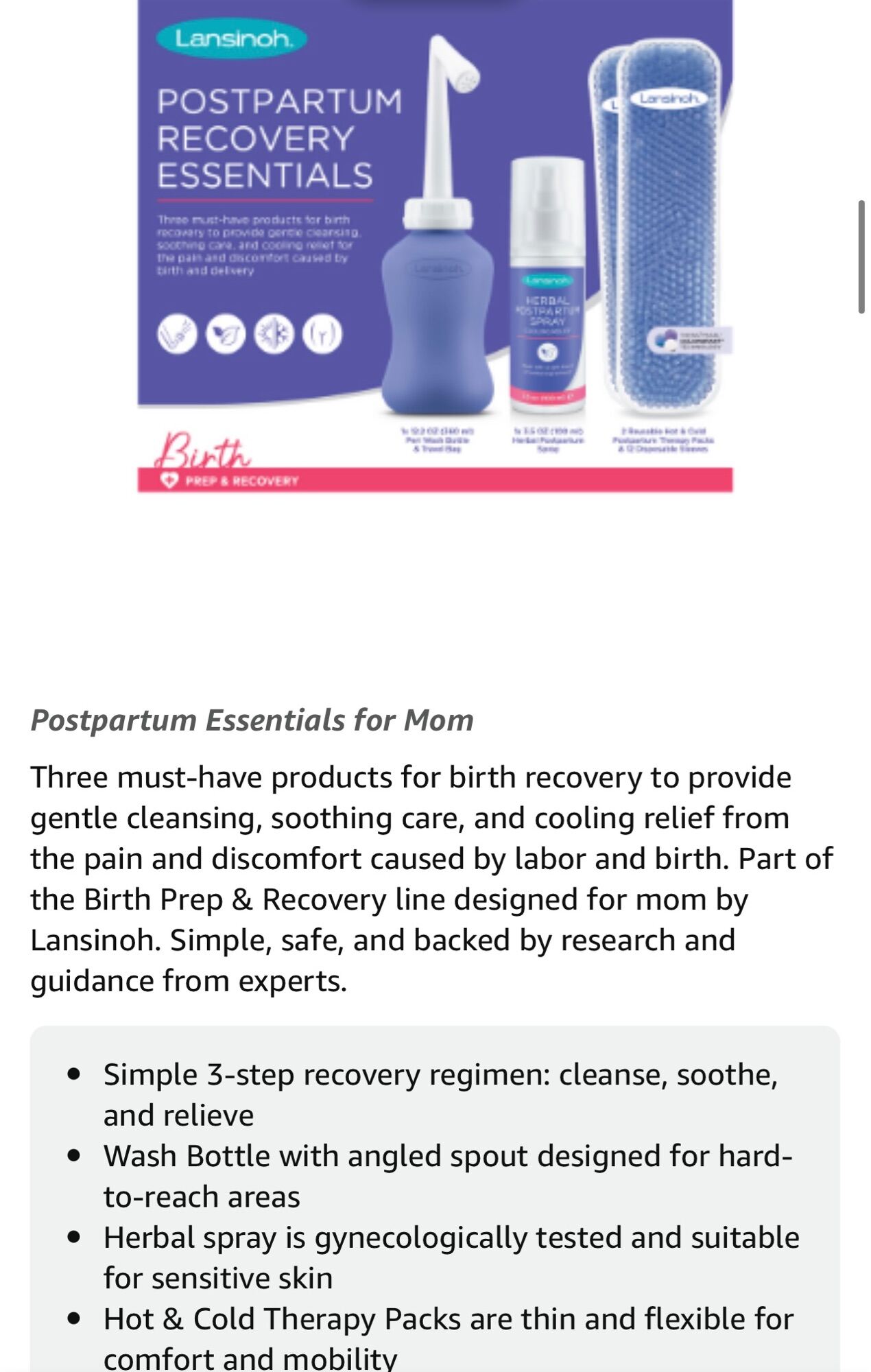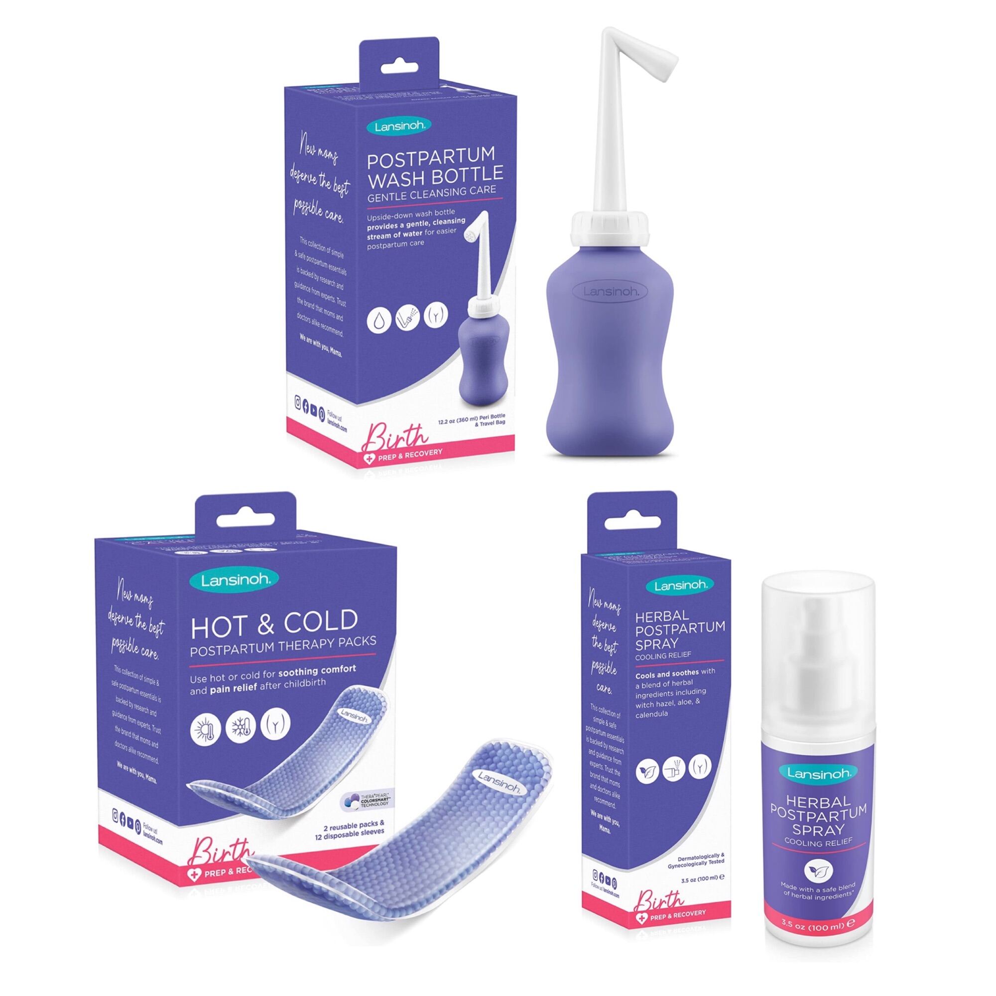 Three must-have products for birth recovery to provide gentle cleansing, soothing care, and cooling relief from the pain and discomfort caused by labor and birth. Part of the Birth Prep & Recovery line designed for mom by Lansinoh. Simple, safe, and backed by research and guidance from experts.