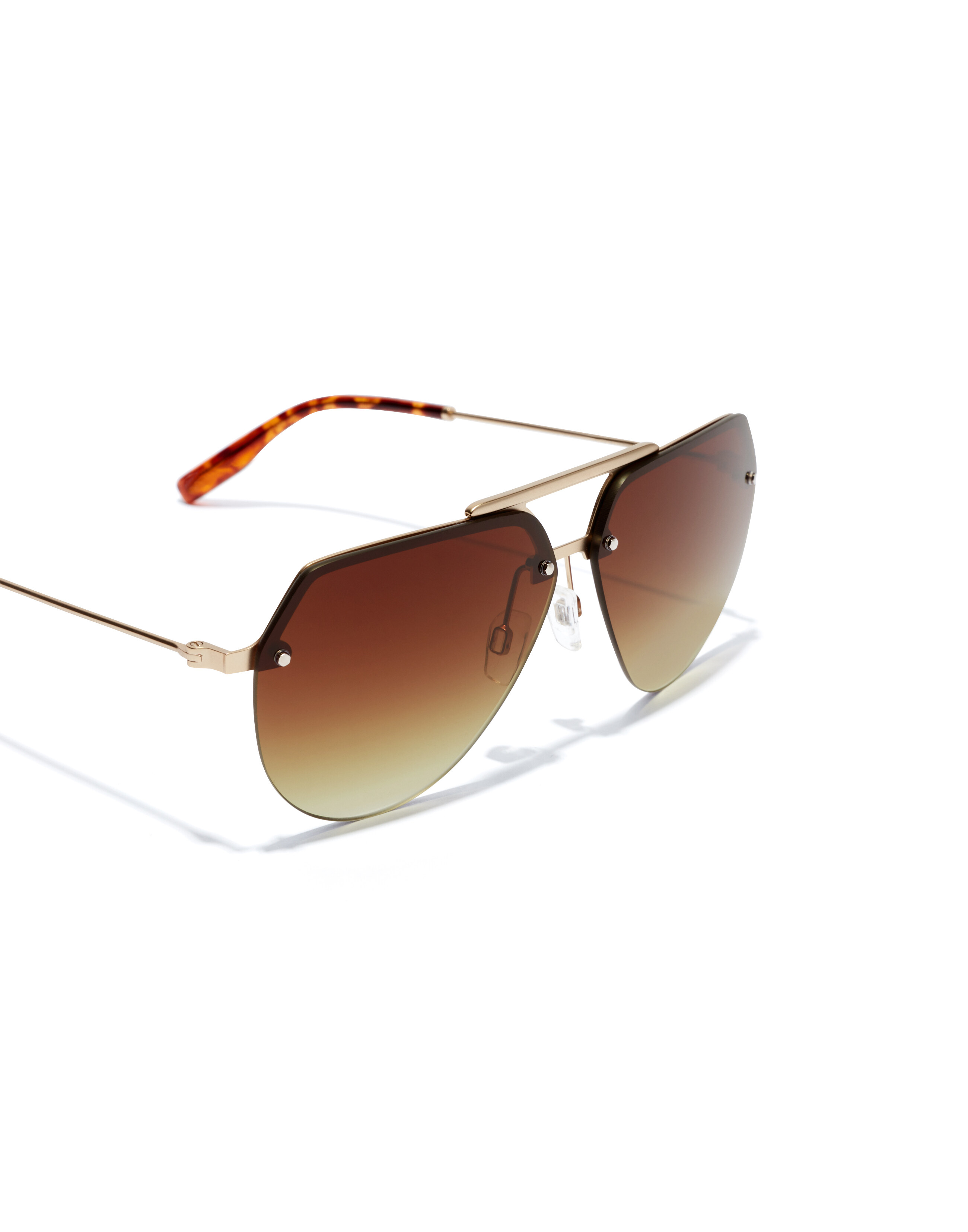 A brushed gold frame, gradient brown lenses and tortoiseshell ear pieces are the classic colour combination of the teardrop aviator. But the rimless design, bold upper bridge, angular cuts at the temple and bridge, and stud detailing on the lenses break with convention.