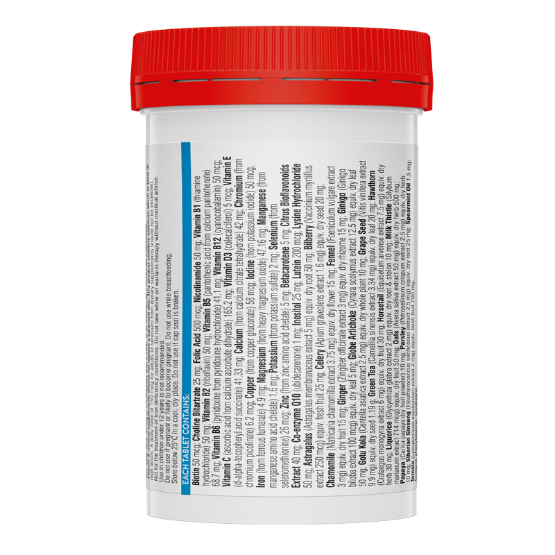 If symptoms persist consult your healthcare professional. Vitamin supplements should not replace a balanced diet. This product contains selenium, which is toxic in high doses. A daily dose of 150micrograms for adults of selenium from dietary supplements should not be exceeded. Not for the treatment of iron deficiency conditions. Do not take while on warfarin therapy without medical advice. Contains gluten. The recommended dose of this medicine provides small amounts of caffeine.