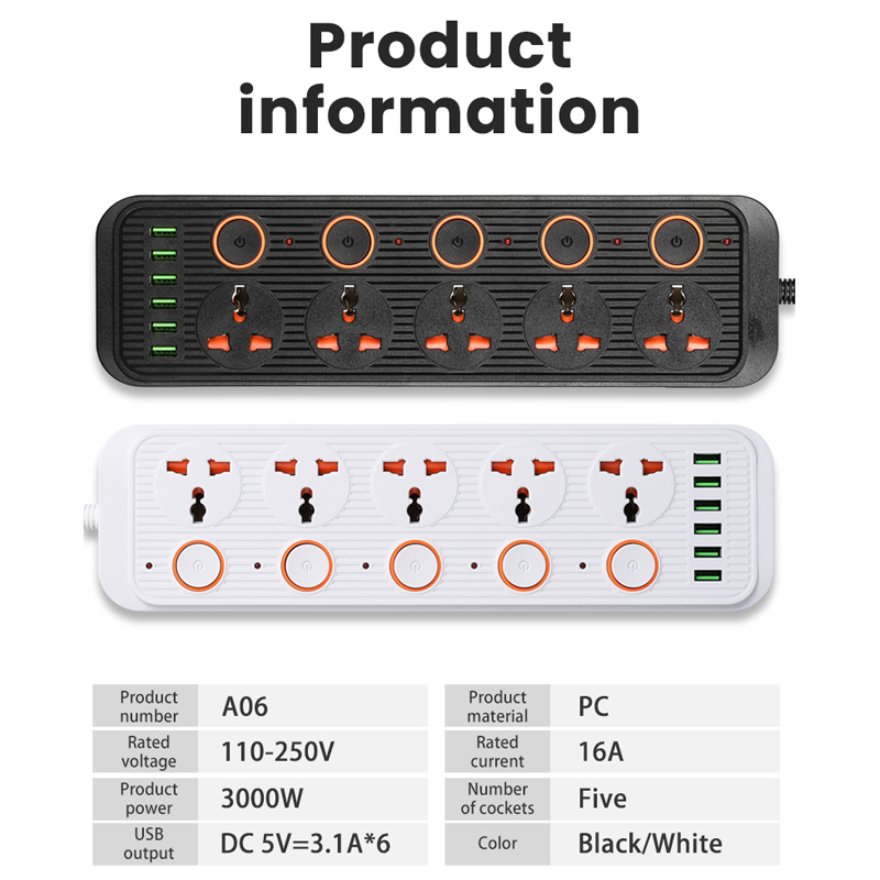 (Gift)JFKDX A06 UK Plug 3000W Power Strip 3 Universal Outlet+6 USB Extension Socket 3.1A Separate Switch Wall Mounted For Home Office With 2 Meter Power Socket