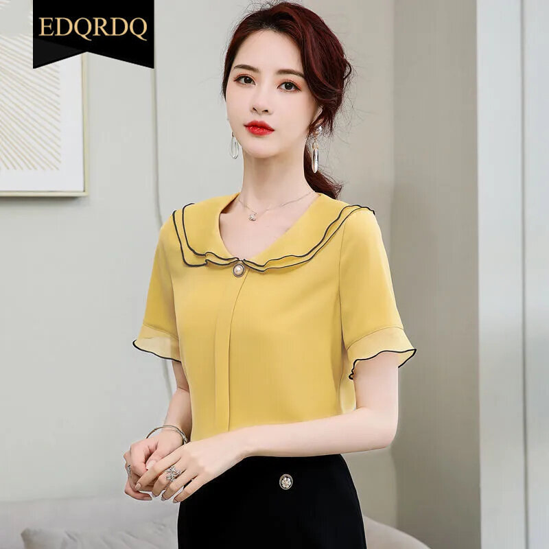 EDQRDQ Women's Doll Collar Puffy Sleeve Solid Color Chiffon Tops Short Sleeves Ruffle Blouse
