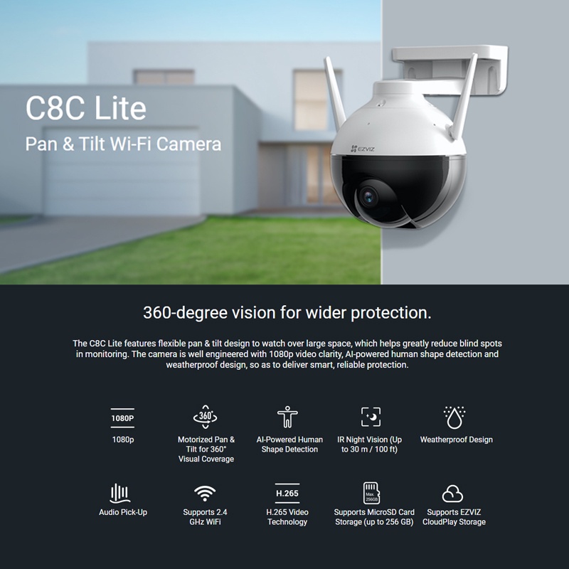 Welcome to EZVIZ Official Store~ We are 100% Singapore in stock, ship within 24 hours of your order! Specifications: ✅Model CS-C8C Lite (1080P) ✅Safty Mark No.:210084-15 ✅Camera -Image Sensor: 1/2.7" Progressive Scan CMOS -Shutter Speed: Self-adaptive shutter -Lens: 4mm @ F1.6, view angle: 87° (Horizontal), 105° (Diagonal) -PT Angle: Pan: 352°, Tilt: 95° -Minimum Illumination: 0.5 Lux @ (F1.6, AGC ON), 0 Lux with IR (data is obtained from EZVIZ laboratories) -Lens Mount: M12 -Day & Night: IR-cut filter with auto switching -DNR: 3D DNR -WDR: Digital WDR -Black & White Night Vision: 30 m / 100 ft. ✅Video & Audio -Max Resolution: 1920 × 1080 -Frame Rate: Max: 30fps; Self-Adaptive during network transmission -Video Compression: H.265 / H.264 -H.265 Type: Main Profile -Video Bit Rate: Ultra-HD; Hi-Def; Standard. Adaptive bit rate. -Audio Bit Rate: Self-Adaptive -Max. Bitrate: 2Mbps ✅Network -Wi-Fi Standard: IEEE802.11b, 802.11g, 802.11n -Frequency Range: 2.4 GHz ~ 2.4835 GHz -Channel Bandwidth: Supports 20MHz -Security: 64/128-bit WEP, WPA/WPA2, WPA-PSK/WPA2-PSK -Transmission Rate: 11b: 11Mbps,11g :54Mbps,11n :72Mbps -Wi-Fi Pairing: AP pairing -Protocol: EZVIZ Cloud Proprietary Protocol -Interface Protocol: EZVIZ Cloud Proprietary Protocol -Wired Network: RJ45 × 1(10M/100M Adaptive Ethernet Port) ✅Storage -Local Storage: Micro SD card slot (Max. 256G) -Cloud Storage: EZVIZ Cloud Storage ✅Function -Smart Alarm: AI-powered human shape detection -Customized Alert Area: Supports -Audio: Supports mic -General Function: Anti-flicker, dual-stream, heart beat, password protection, watermark ✅General -Operating Conditions: -30°C ~ 60°C(-22°F to 140°F ), humidity 95% or less (non-condensing) -IP Grade: Weatherproof Design -Power Supply: DC 12V / 1A -Power Consumption: MAX. 6 W -Dimensions: 158 × 157 × 149 mm (6.22 × 6.18 × 5.87 inch) -Packaging Dimensions: 197 × 185 × 205 mm (7.76 × 7.28 × 8.07 inch) -Net Weight: 510 g (17.99 oz) -Weight (With Package): 885 g (31.22 oz) ✅In the box -Camera (×1) -Power Adapter (×1) -Screw Kit (×1) -Waterproof Kit (×1) -Drill Template (×1) -Regulatory Information (×1) -Quick Start Guide (×1) ✅Certifications -Certifications UL / FCC / CE / WEEE / REACH / ROHS