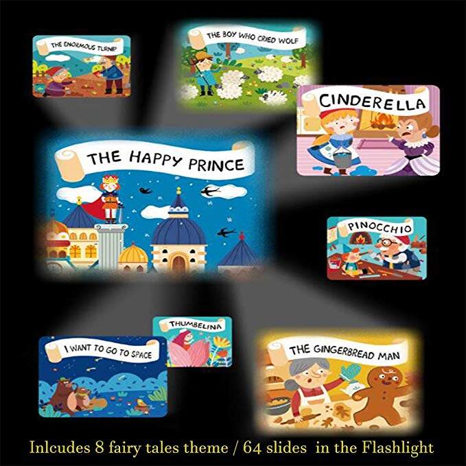 • TELL STORY TO KIDSThere are 8 fairy tales Movies include 64 Slides photos in the Flashlight,turn on the Flashlight and tell a story to your kid,playing like a child reading a picture book. everyone in the family can enjoy themselves before going to bed and take baby to a gentle sleep.Through the cute image and story,
